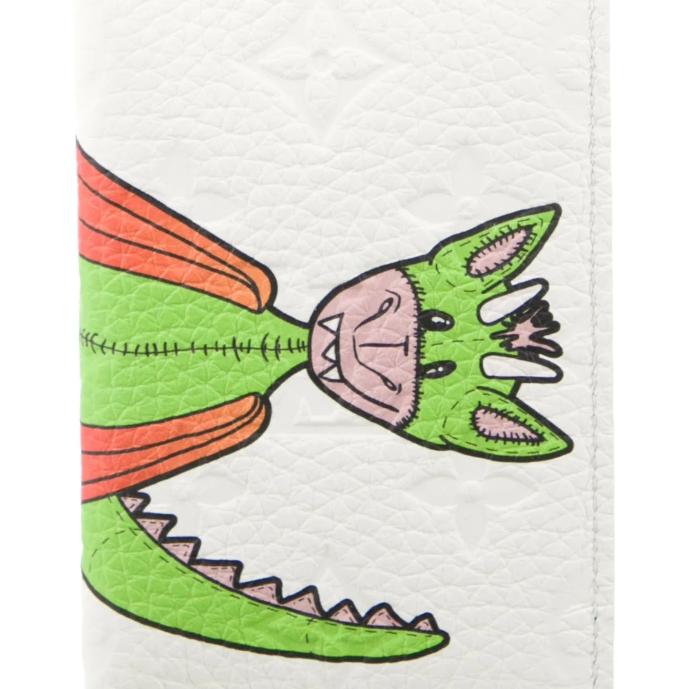 This Louis Vuitton wallet is crafted from premium white printed calfskin leather, adorned with a playful and artistic design. Featuring a leather-lined interior with card slots and a flap closure, this wallet combines practicality with a whimsical luxury aesthetic. It comes with a box and dust bag for added sophistication.