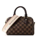 This Louis Vuitton Damier Ebene Speedy Bandouliere 20 is a timeless bag in brown checkered canvas. The cowhide leather handles and brass hardware add elegance, while the red fabric interior provides vibrant contrast and functionality.