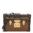 This Louis Vuitton Reverse Monogram Petite Malle is a compact, trunk-style bag in reverse monogram canvas. Featuring black leather trim, an adjustable shoulder strap, and reinforced black hardware end caps, it embodies the charm of vintage elegance. The beige leather interior with a patch pocket enhances its sophisticated, structured design.